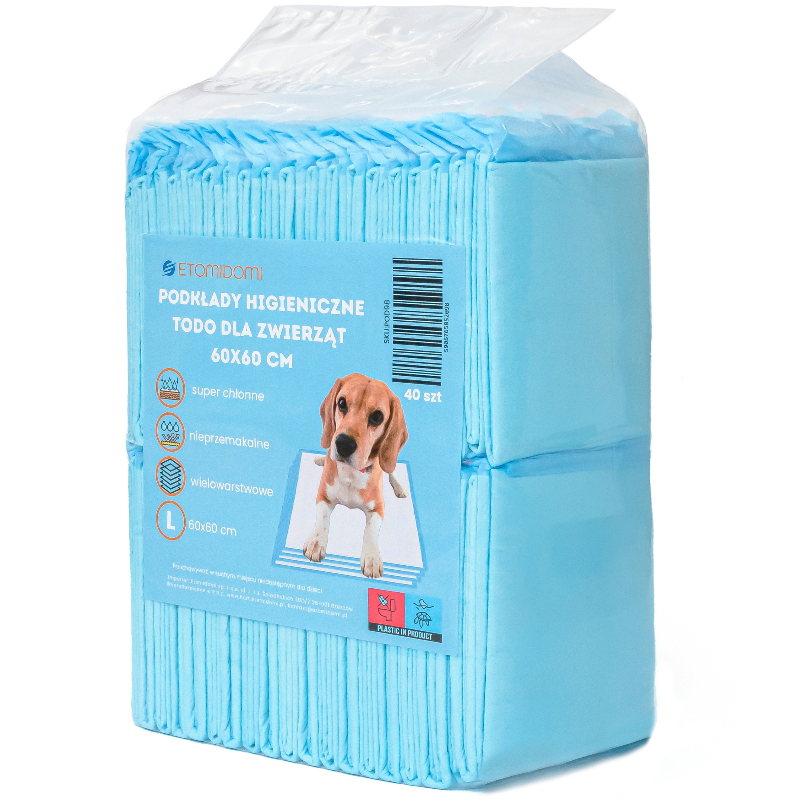 Podkłady higieniczne Todo 60 x 60 cm to niezawodne rozwiązanie dla właścicieli psów i kotów, idealne do treningu higienicznego szczeniąt, ochrony podłóg czy opieki nad starszymi zwierzętami. Dzięki superchłonnemu polimerowi (SAP) i wielowarstwowej strukturze skutecznie zatrzymują wilgoć, zapewniając suchość i higienę. Nieprzemakalna warstwa dolna chroni powierzchnie, a rozmiar 60 x 60 cm (rozmiar L) jest odpowiedni dla zwierząt różnych ras. Opakowanie zawiera 40 sztuk, co gwarantuje długotrwałe użytkowanie i wygodę.